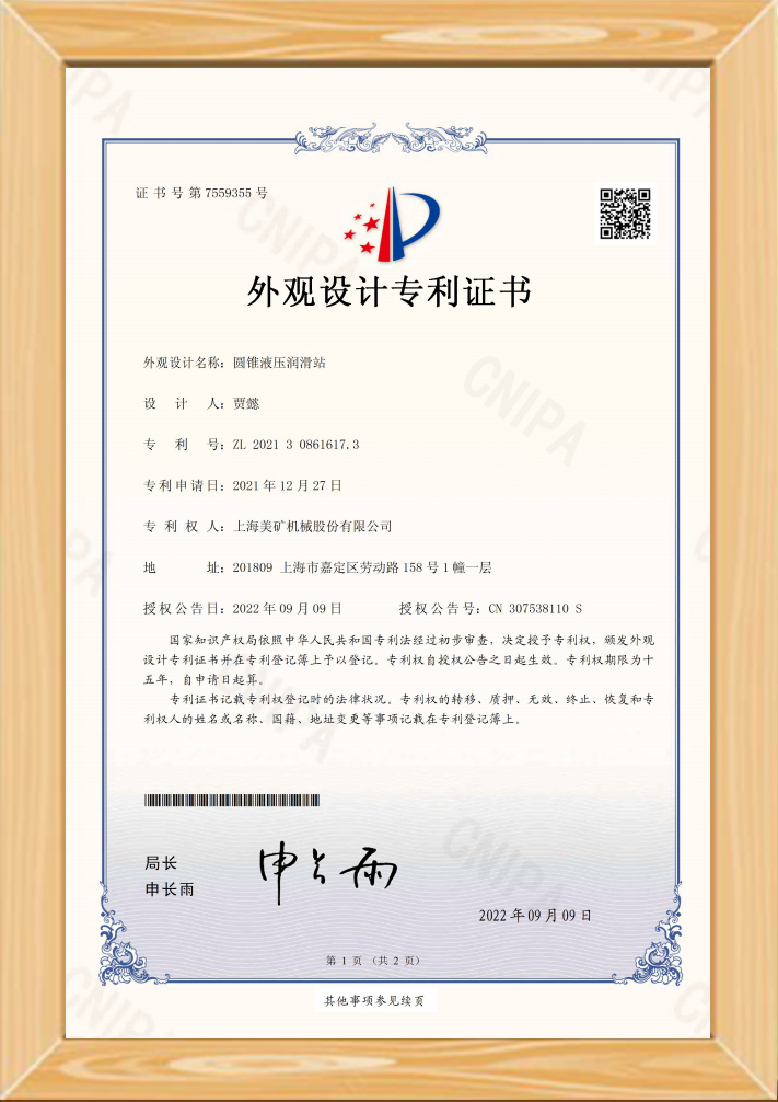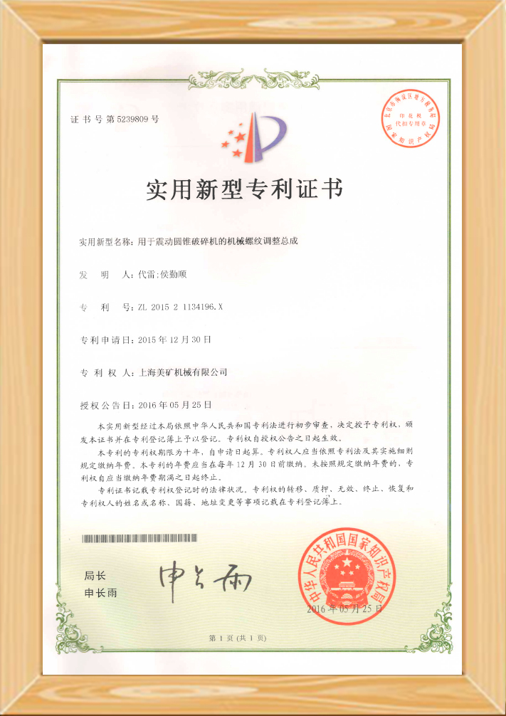 • 一種自動加注潤滑脂的圓錐破碎機水平軸總成專利證書